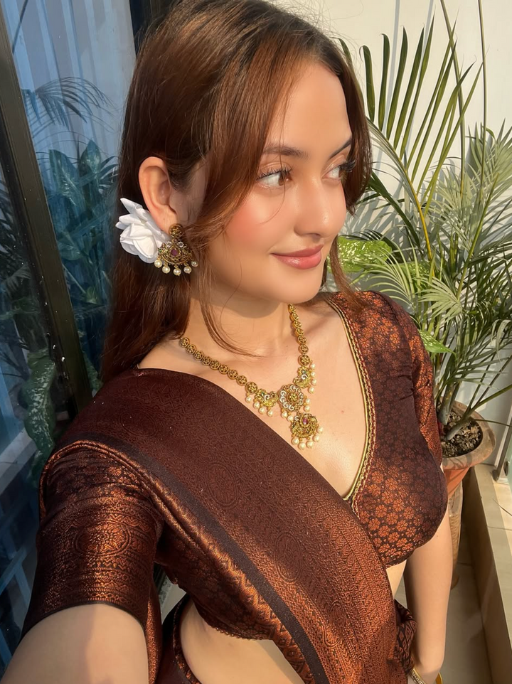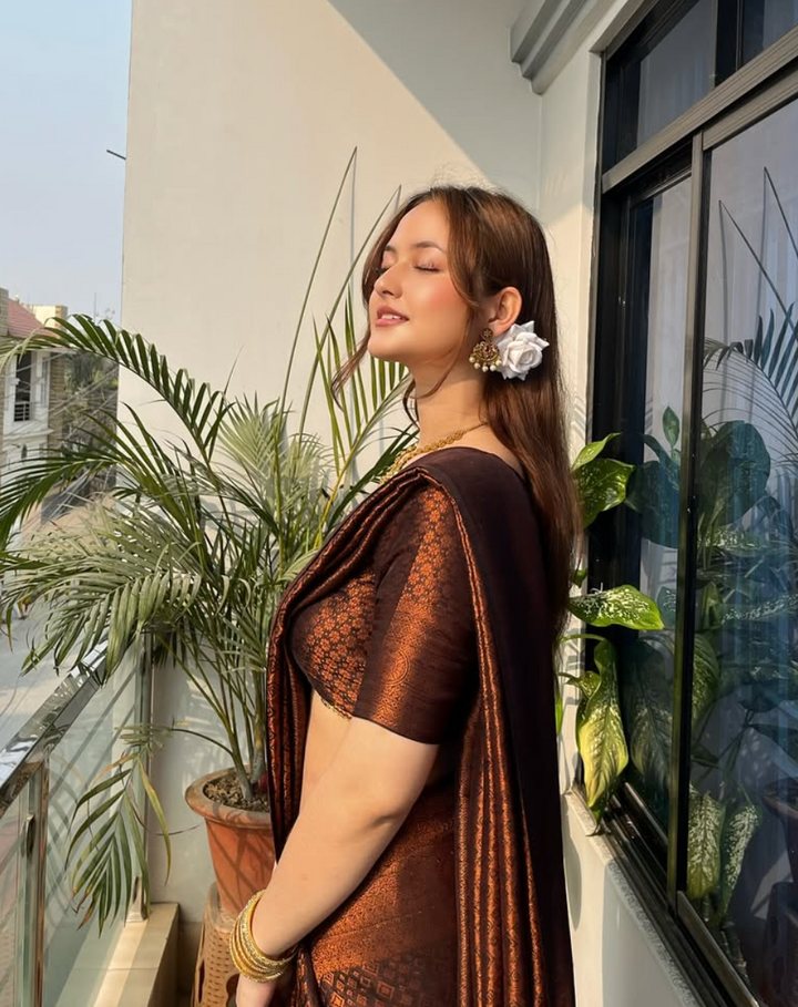 Elevate your wardrobe with the Royal Copper Weave Saree, a sophisticated blend of traditional craftsmanship and elegant design. Expertly woven with rich copper-toned threads, this saree offers a lustrous finish that enhances your presence at any occasion. Its intricate texture and timeless appeal make it a refined choice for those who appreciate quality and style. Perfect for formal events or cultural celebrations, this saree provides comfort and grace while reflecting a heritage of exquisite artistry.